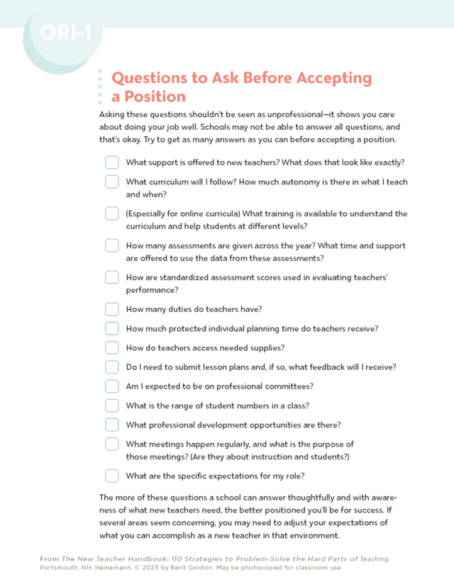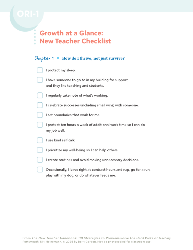 Check off what you regularly have in place, not what happens on a perfect day. If there are a lot of unchecked items, guess what? You’re a normal first-year teacher! Now dip into these strategies and stay here as long as you need.