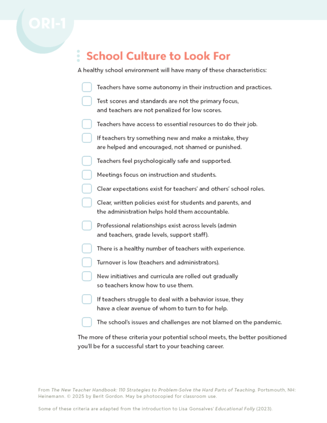 Your school’s culture will be a huge factor in who you become as a new teacher and your ability to feel effective. These checklists will help you evaluate potential schools to find an environment where you can truly thrive.